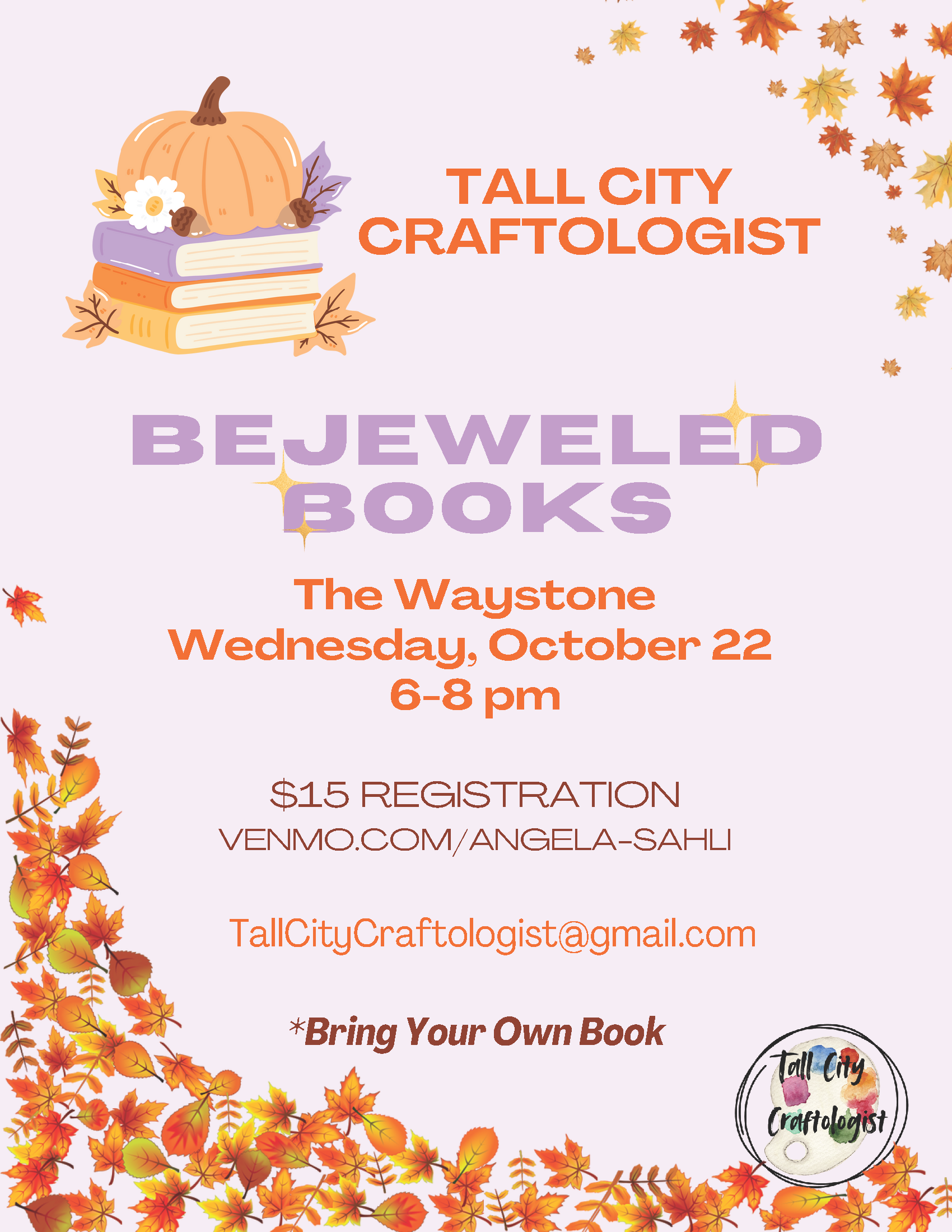Bring your own book along to this highly popular workshop led by the Tall City Craftologist. You'll be bedazzling the book cover with jewels and accents to make it a one-of-a-kind. Didn't finish your book from last time? Bring it again and add some more bling.