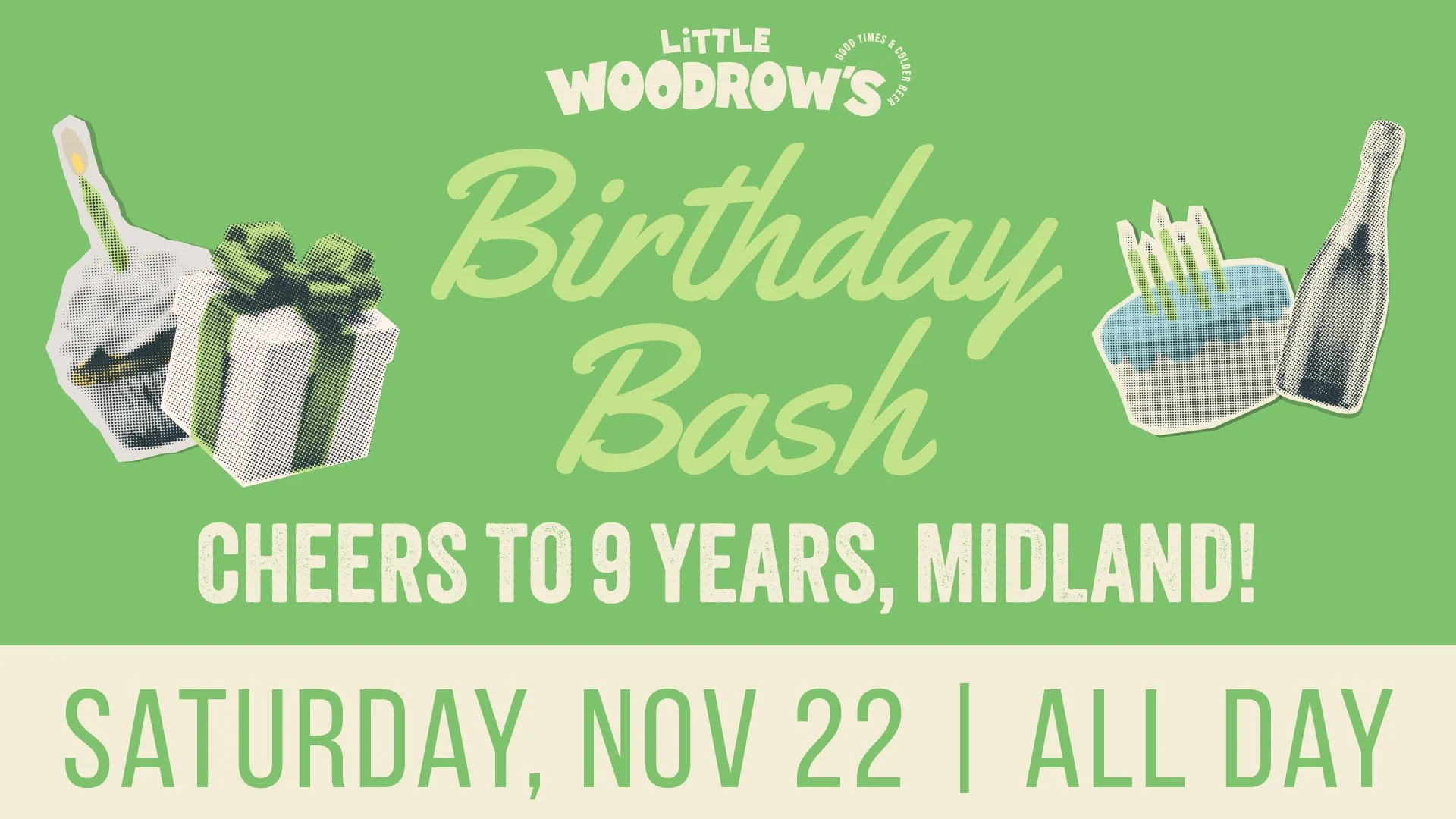 Birthday Bash Saturday, November 22, 2025 10:00 PM 11:00 PM Little Woodrow's Midland 3415 North Loop 250 West Midland, TX, 79707 United States (map) Google Calendar ICS Cheers to 9 years, Midland! Come celebrate LW’s birthday with us! Learn more