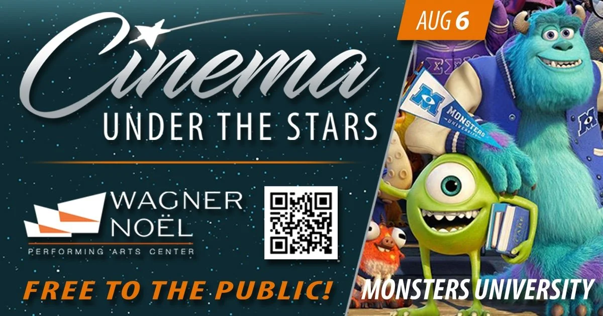 Join us INSIDE the Wagner Noël PAC theater for the last Cinema Under the Stars of the summer season with a back to school themed movie, Monster University!