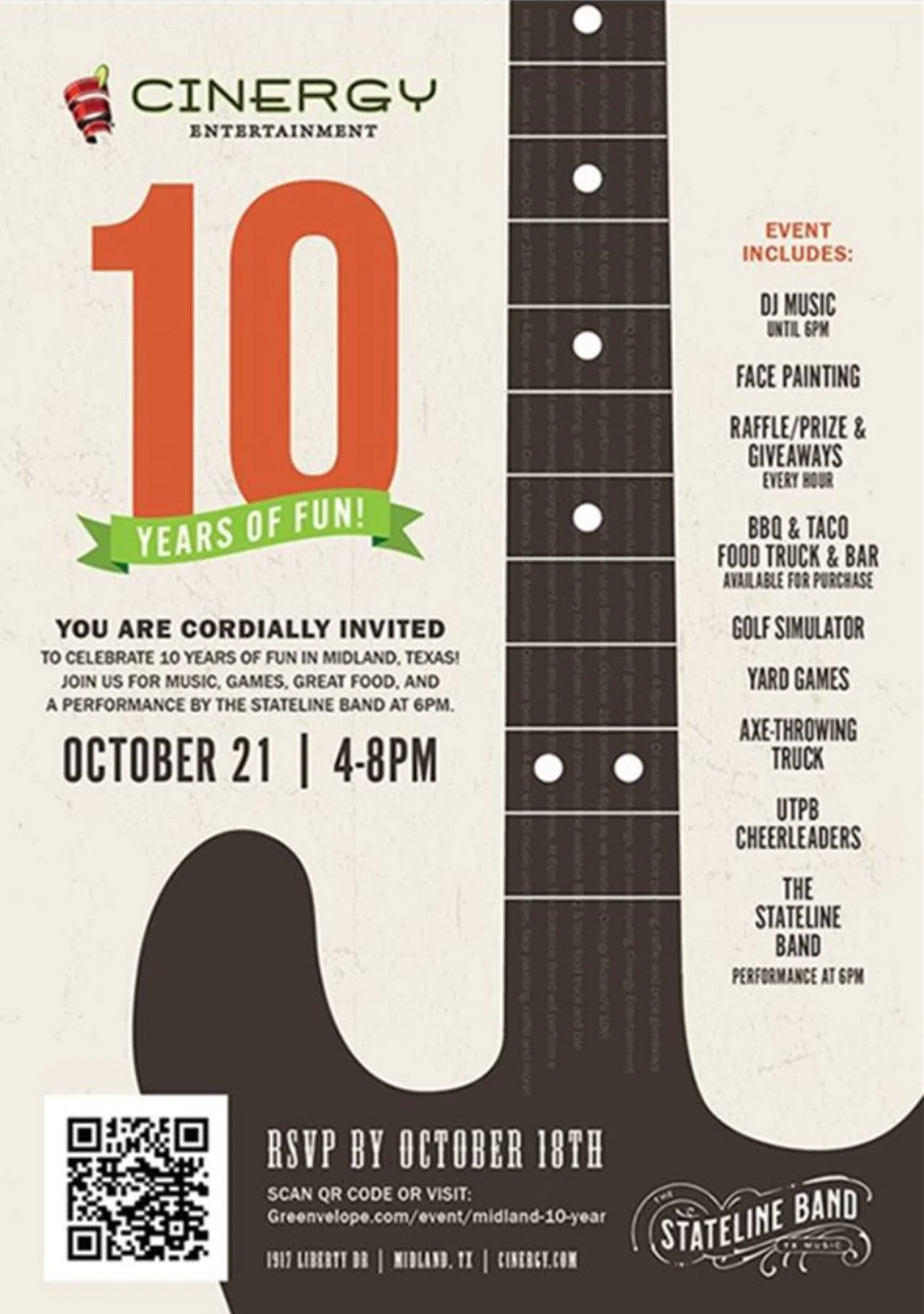 Cinergy Entertainment is thrilled to invite the vibrant community of Midland-Odessa to join in a grand 10-year anniversary celebration of its Midland location! Prepare for a memorable and fun-filled evening of music, games, delicious food, and a live performance from Midland’s very own, The Stateline Band, on Saturday, October 21st from 4-8pm. Event is free to attend and open to the public, festivities will be outside Cinergy Midland.
