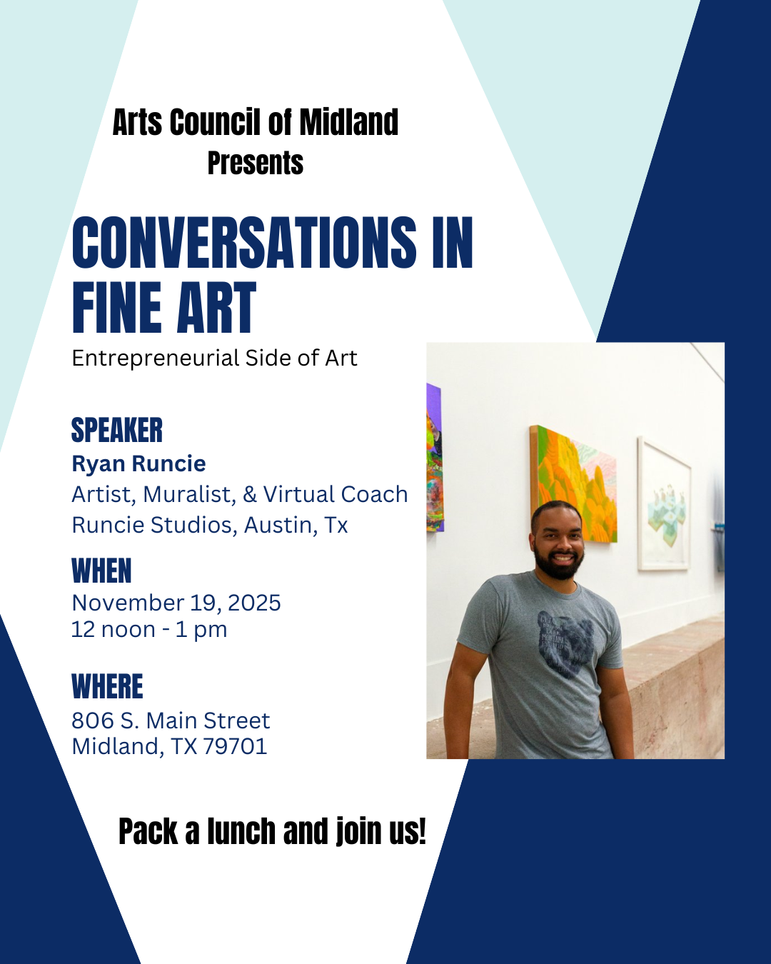 Come and be part of a conversation with Arts Council of Midland Director Danny Holeva and guest speaker Ryan Runcie on November 19. Ryan is an Artist, muralist and educator from Austin Texas. The event is free and open to the community.