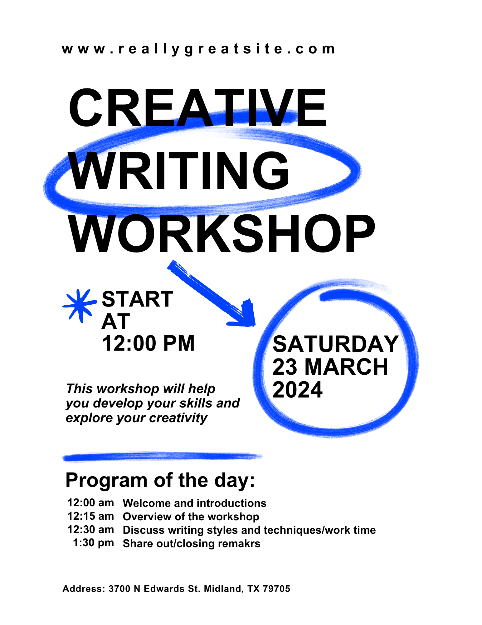 Back to All Events Creative Writing Workshop Saturday, March 23, 2024 12:00 PM 2:00 PM Mugs & Good Reads 3700 Edwards Street Midland, TX, 79705 United States (map) Google Calendar ICS Creative writing workshop for all writers who are interested in collaborating with other writers. Learn more