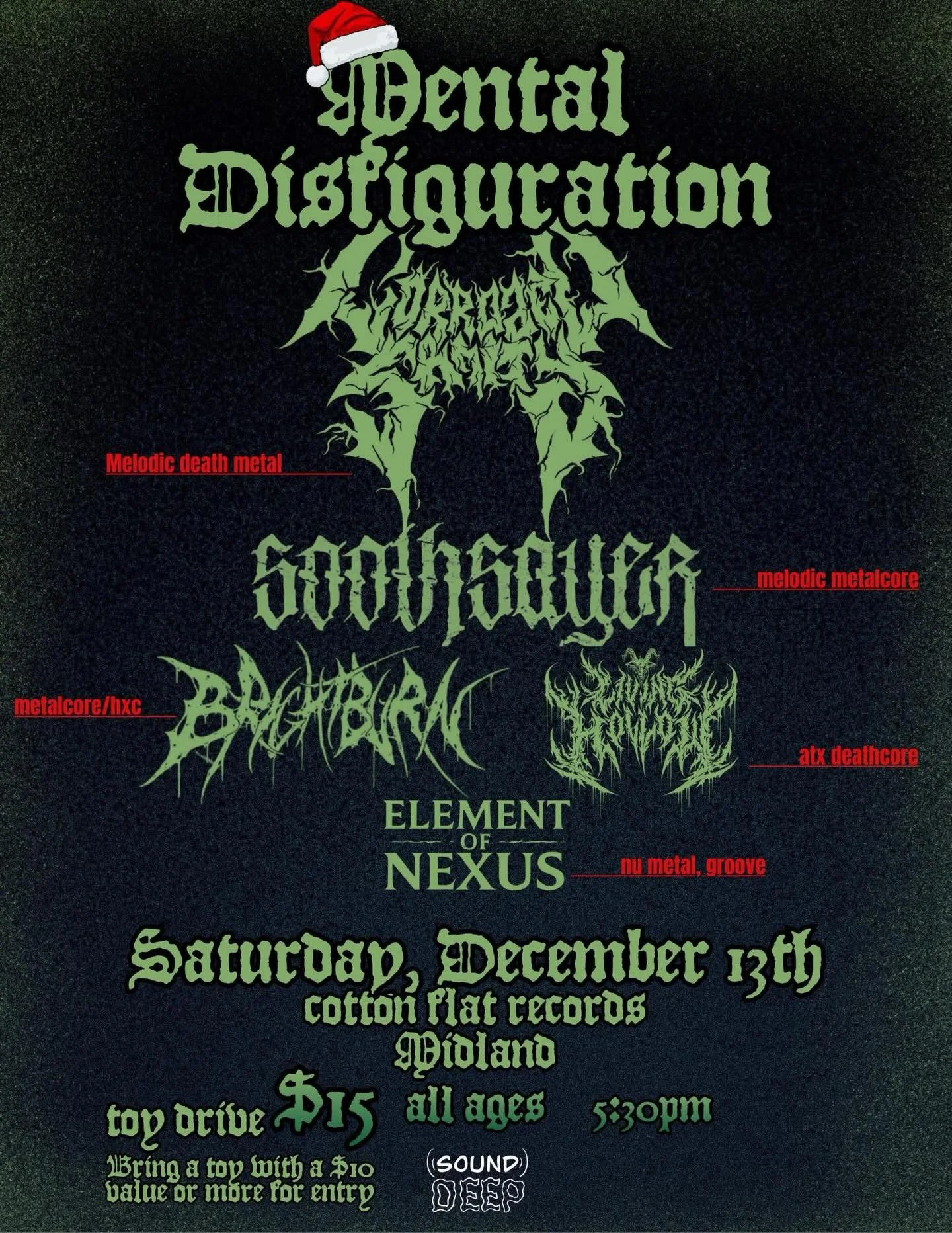 Dental Disfiguration Saturday, December 13, 2025 5:30 PM 10:00 PM Cotton Flat Records 1402 Cotton Flat Road Midland, TX, 79701 United States (map) Google Calendar ICS This Saturday! More metal at the Flat! Come getcha’ pull! Learn more