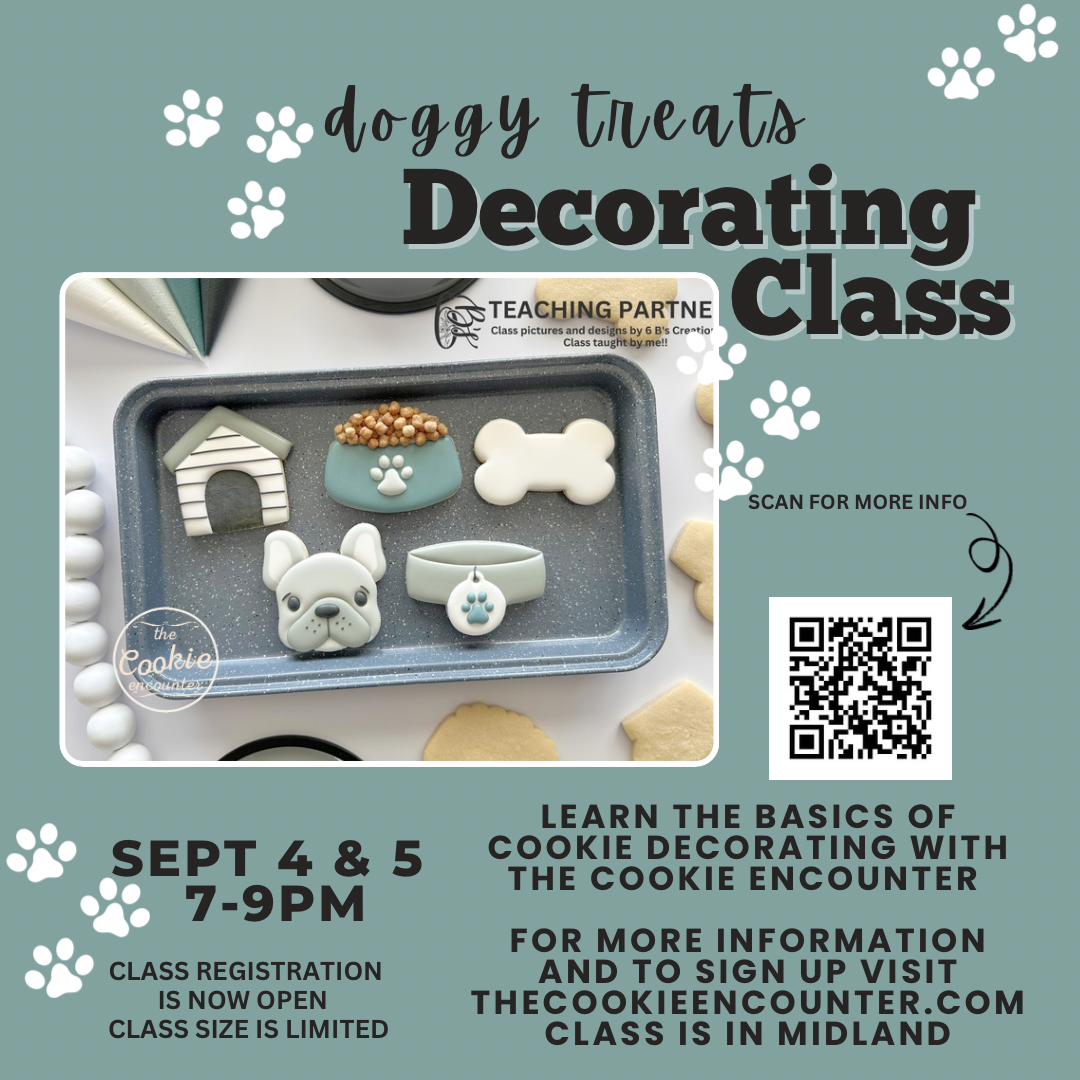 Back to All Events Dog Treat Decorating Class Thursday, September 4, 2025 7:00 PM 9:00 PM The Cookie Encounter 399 West Wall Street Midland, TX, 79701 United States (map) Google Calendar ICS Learn more