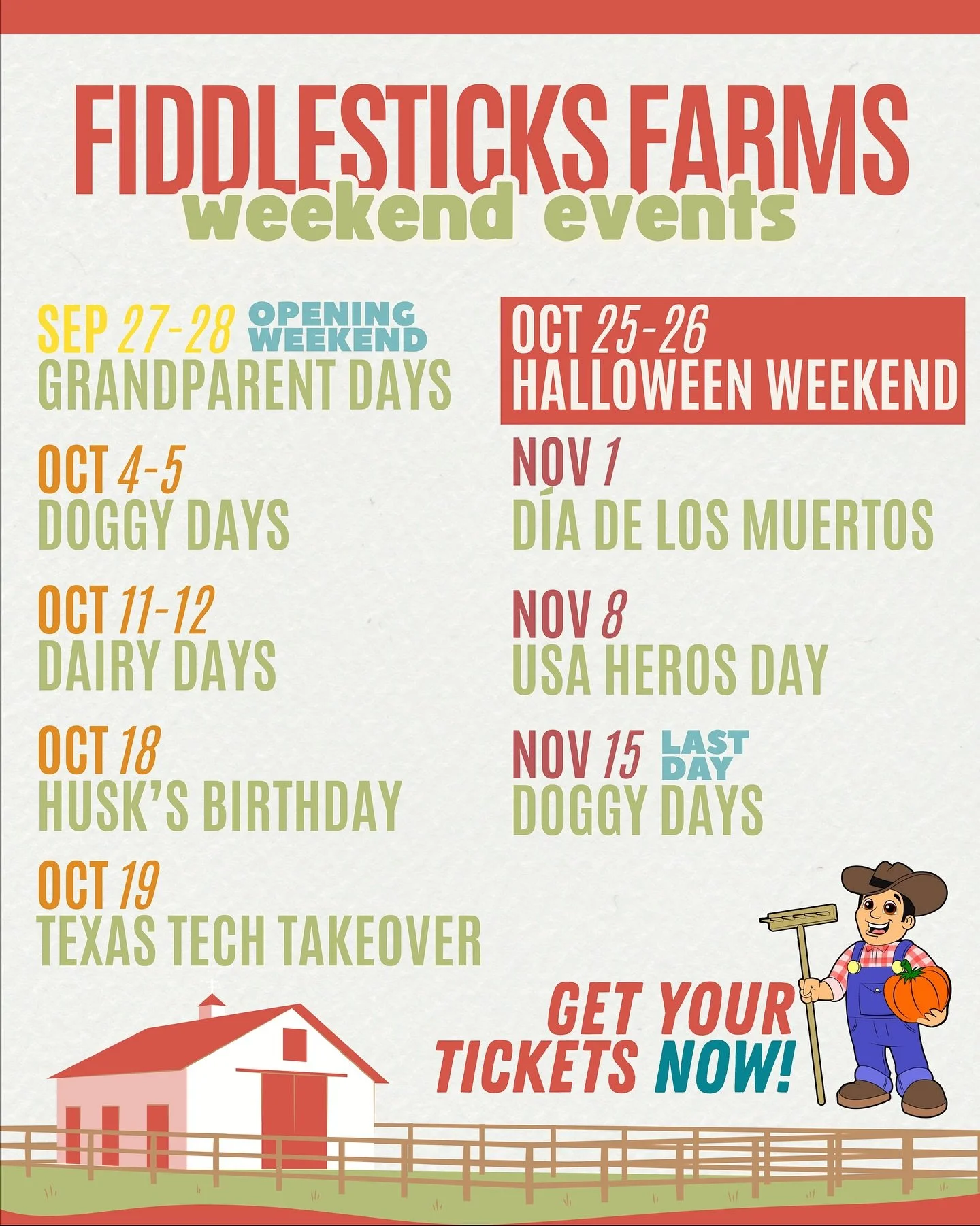Back to All Events Fiddlestick Farms Weekend Events Saturday, September 27, 2025 9:00 AM Sunday, September 28, 2025 4:00 PM Fiddlesticks Farms 5610 East County Road 120 Midland, TX, 79706 United States (map) Google Calendar ICS Season 18 is looking FARMTASTIC! ✨🗓️What’s your favorite weekend!? Get your tickets ONLINE NOW! 💻🎟️ Learn more