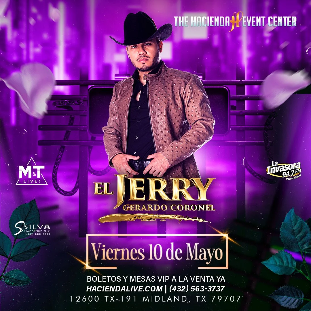 Gerardo Coronel “El Jerry” Friday, May 10, 2024 8:00 PM 11:55 PM La Hacienda Event Center 12600 Texas 191 Midland, TX, 79707 United States (map) Google Calendar ICS Buy Tickets