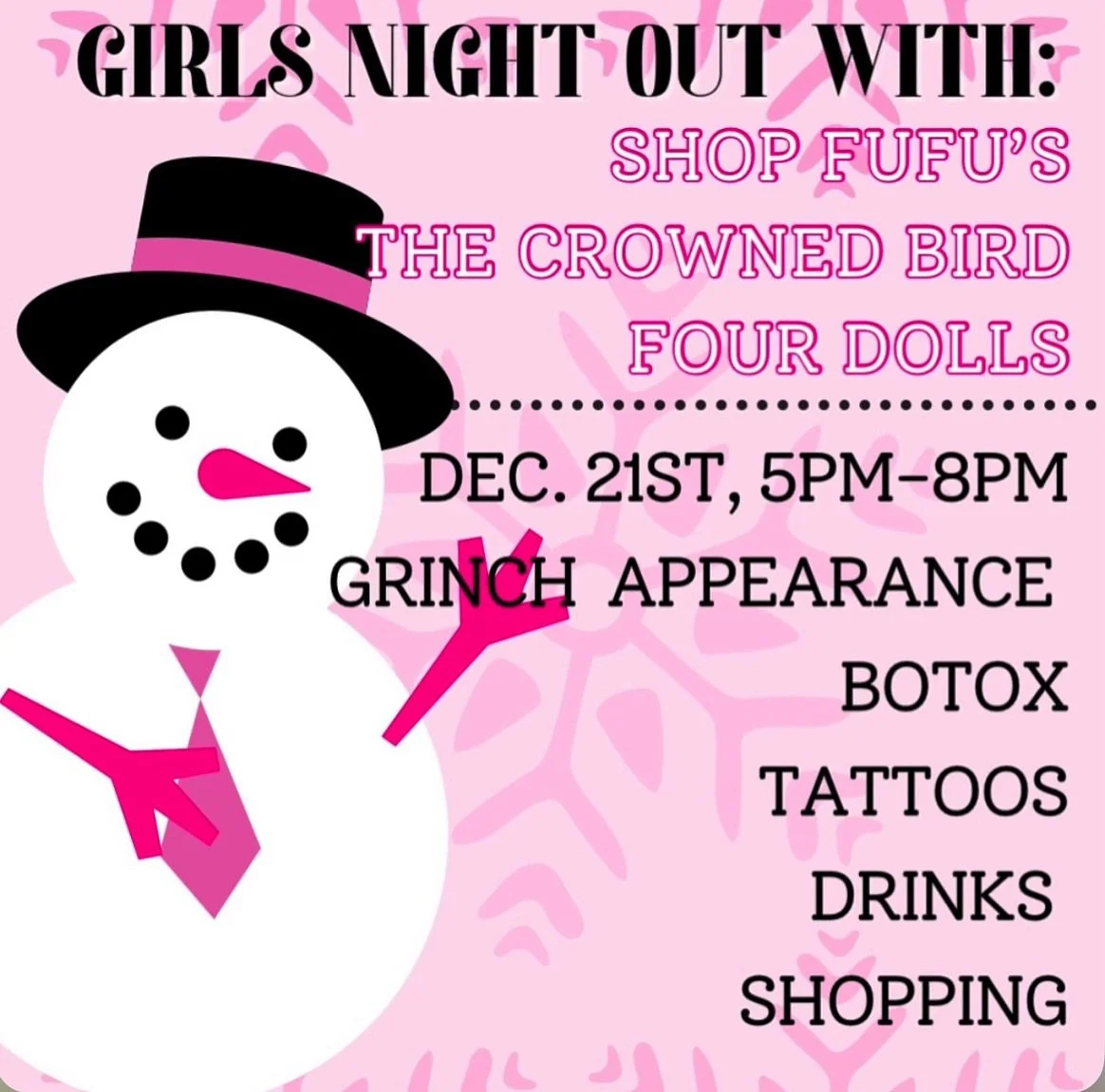 We are SO EXCITED to be collaborating with @shop.fufus & @fourdollsboutique to bring our Birdies a night full of fun! We will be having flash tattoos by The Company Ink , drinks, THE GRINCH & more!! Stop by & enjoy a glamorous night!