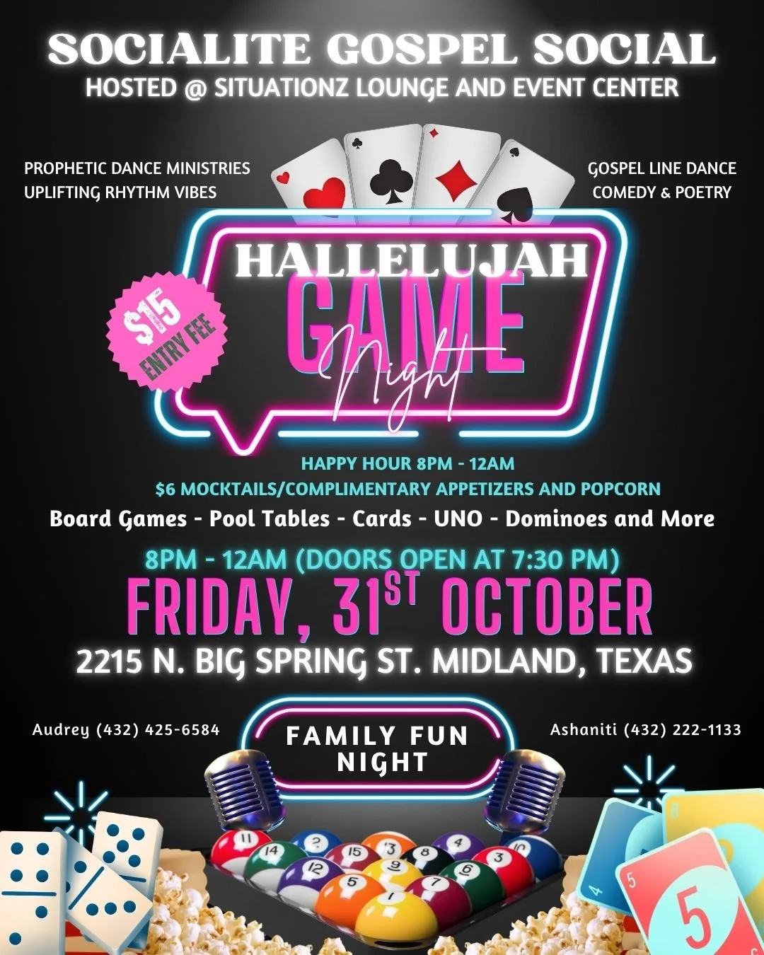 Hallelujah Game Night, October 31st, from 8pm to Midnight. we are reaching out for your support, Entry Fee $15 per person, it includes, Complimentary Appetizers, Popcorn, fun and laughter.