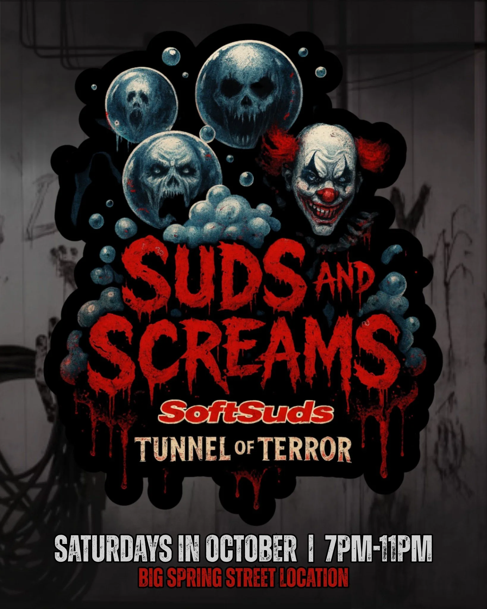 Back to All Events Haunted Car Wash Saturday, October 4, 2025 7:00 PM 11:00 PM Soft Suds Car Wash and Auto Spa 3510 North Big Spring Street Midland, TX, 79705 United States (map) Google Calendar ICS It's time!!!!!!! Learn more