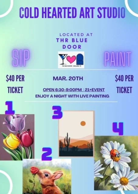 Say hello to spring with a painting class at The Blue Door. Pick your favorite of the four paintings, then contact Cold Hearted Art Studio to book your easel.