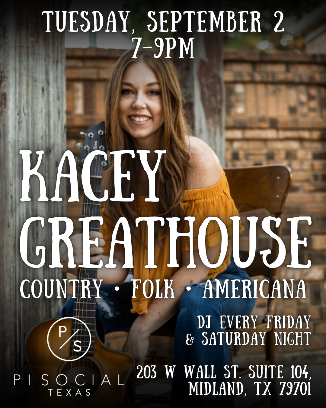 Join us at Pi Social for a delightful evening with Kacey Greathouse, whose rich blend of country, folk, and Americana promises to enchant and inspire from 7-9 PM. Let Kacey’s enchanting vocal work be the backdrop to an evening filled with our signature craft cocktails, culinary delights, and the warm, inviting ambiance of downtown Midland’s favorite gathering spot.