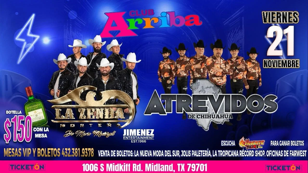 La Zenda Y Atrevidos Friday, November 21, 2025 8:00 PM 11:00 PM Club Arriba 1006 South Midkiff Road Midland, TX, 79701 United States (map) Google Calendar ICS FOR TICKETS AND TABLES PLEASE CALL 432-381-9378 Learn more