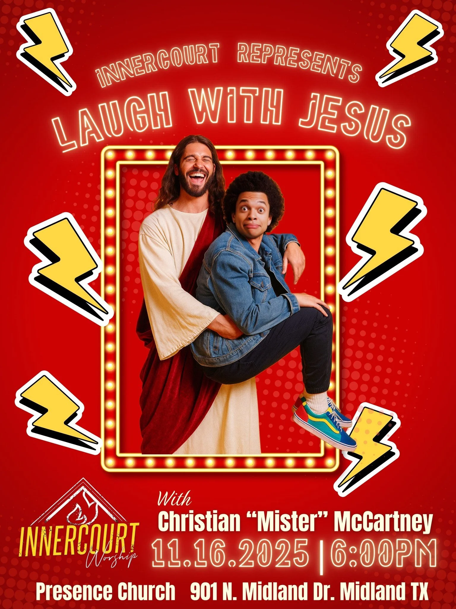 Laugh with Jesus Sunday, November 16, 2025 6:00 PM 8:00 PM Inner Court Midland, TX United States (map) Google Calendar ICS GET READY TO LAUGH WITH JESUS!! save the date Sunday night November 16! Learn more