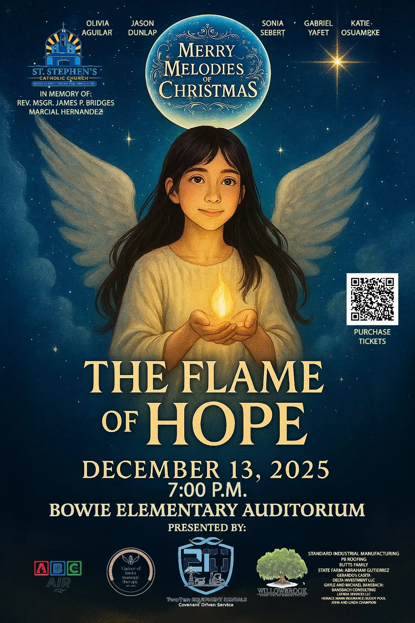 Merry Melodies of Christmas: The Flame of Hope is a breathtaking musical production featuring soaring vocals, heart-stirring narration, original music, and classic carols reimagined in a cinematic style. Follow Gabriel and Sonia—two angelic guides—as they lead us on a journey of light overcoming darkness and the eternal flame of hope born in Bethlehem.