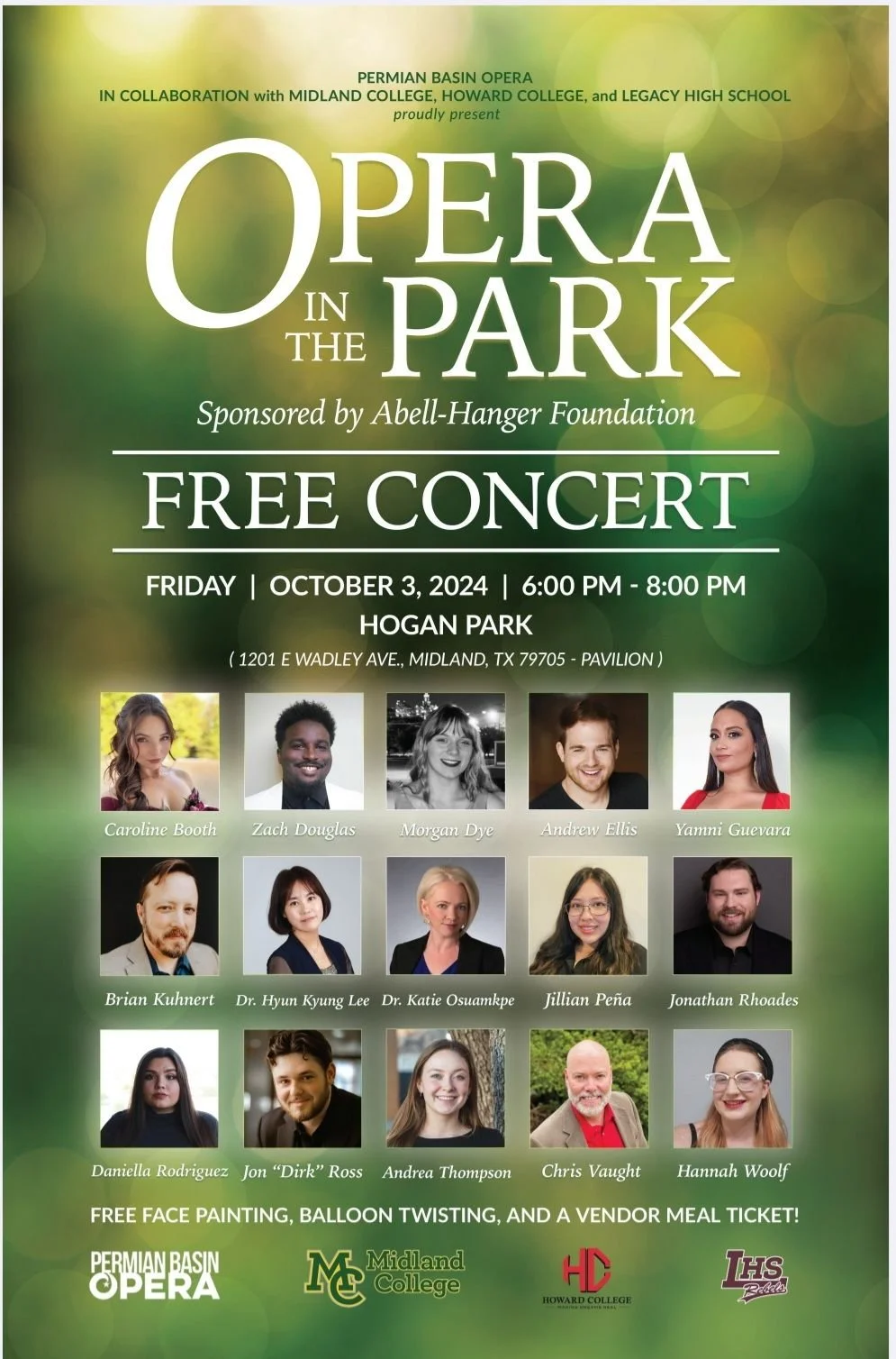 Permian Basin Opera's most loved FREE comunity event "Opera in the Park" is back. Please join us Friday, October 3 from 6-8 pm at Hogan Park Pavilion for what will be an unforgettable night! Oh yea...and there will be FREE facepainting, balloon twisting, and a meal ticket to grab a treat at one of the participating food trucks (only while supplies last). This event is for all family members and we would love the Permian Basin to join us. For further questions, please email info@mypbo.org. We can't wait to see you there!