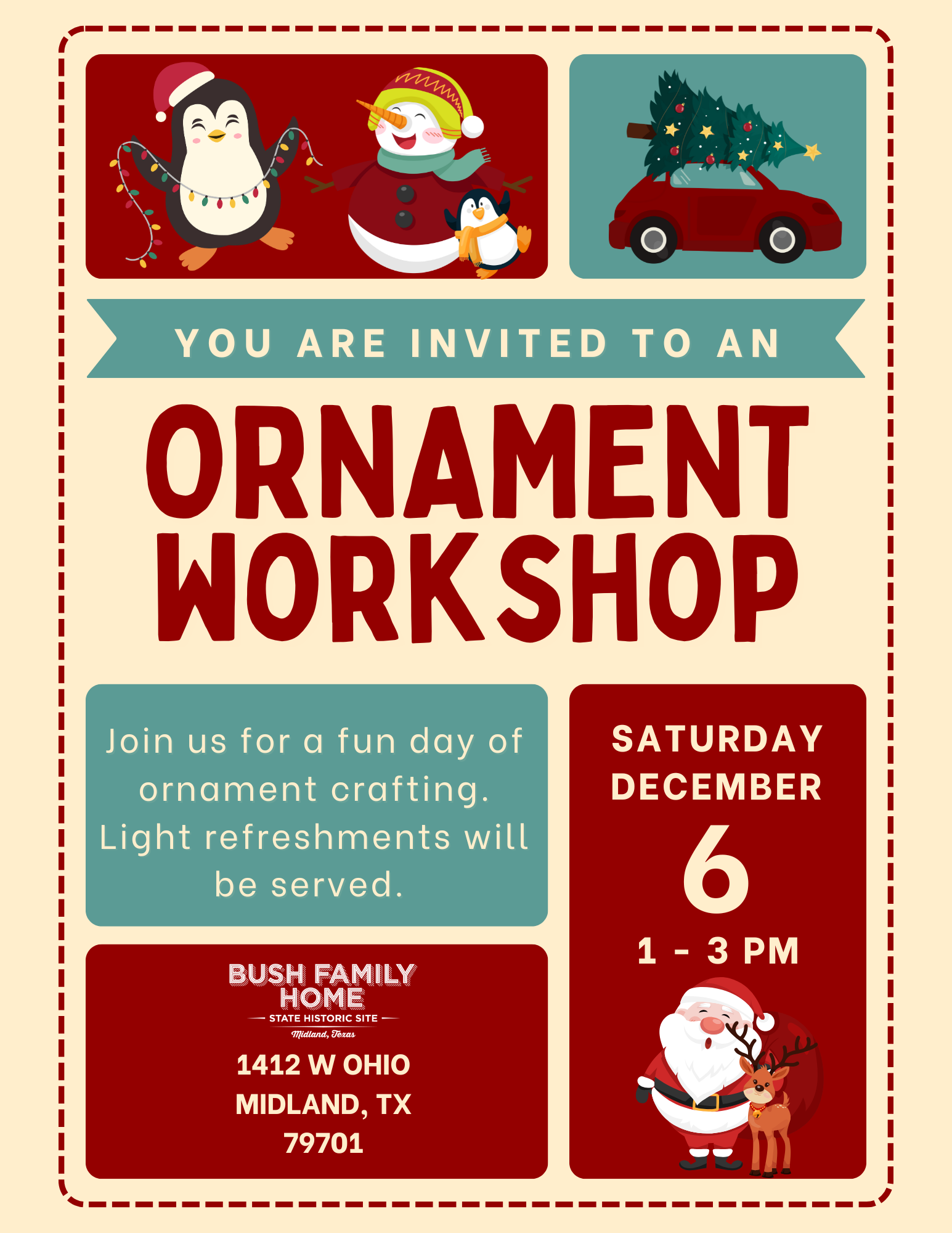 Begin the holiday season with the Bush Family Home 2nd Ornament Workshop on December 6 from 1:00 pm to 3:00 pm. There will be Christmas music, crafting, and some refreshments, like cookies, hot chocolate, and apple cider. Make an ornament for the tree and enjoy all the warm moments of the season
