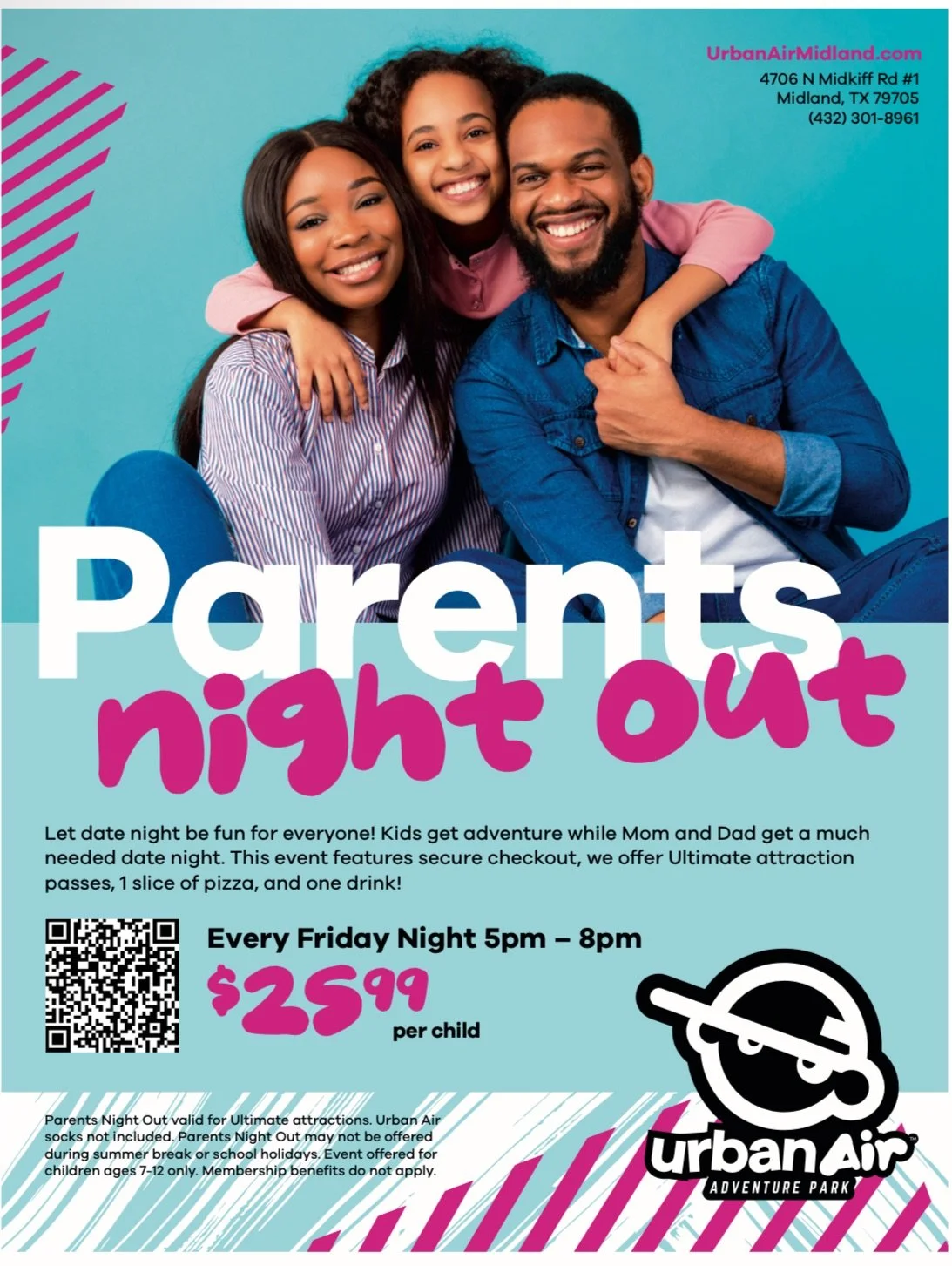Need a babysitter for a Night out? Drop off your kiddo (7-12yrs) at Urban Air 5-8pm EVERY FRIDAY! 432-301-8961 Police & Crew member supervision! $25.99per child, pass access, slice pizza & drink