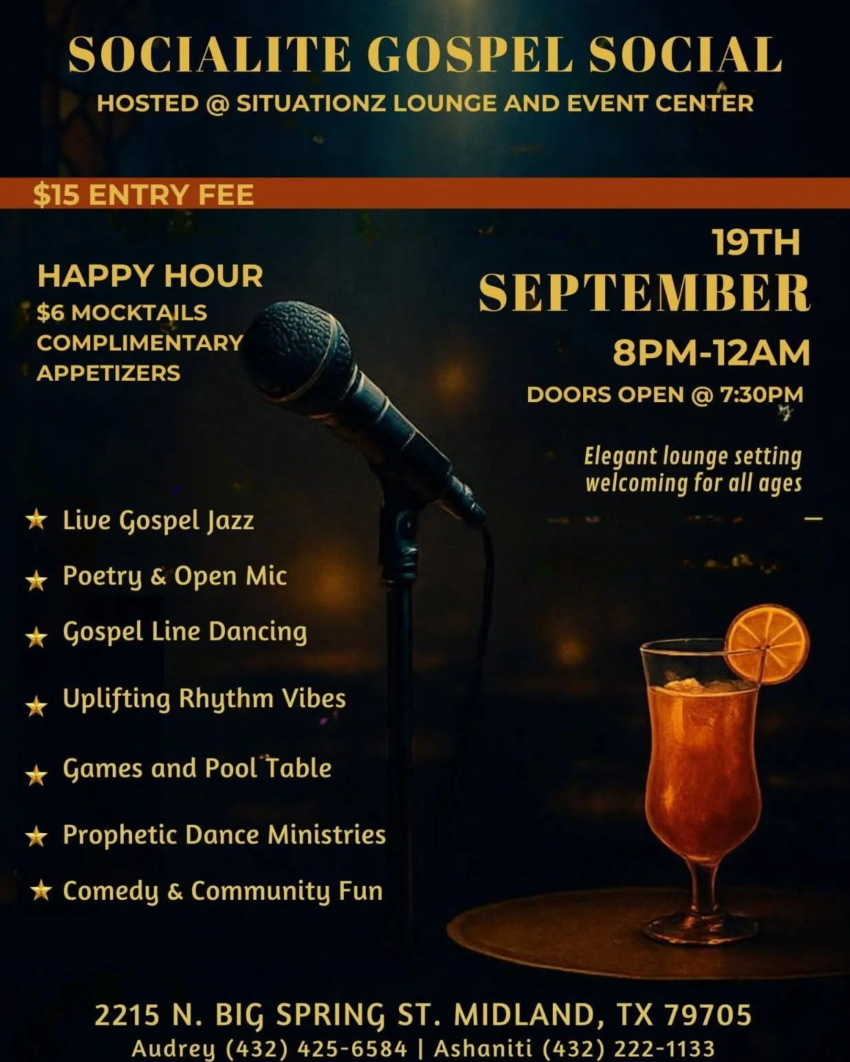 Socialite Journey hosting Socialite Gospel Social at Situationz Lounge and Event Center, Sept 19th from 8pm to Midnight, doors open at 7:30pm, Happy Hour-8pm to 10pm, $6 Mocktails and Complimentary Appetizers. Come out and sign up for Karaoke, Open Mic, Gospel Line Dancing, Comedy, Dance Ministry and listen to the Gospel Jazz in town. 2215 N. Big Spring St., Midland Texas. Come out bring a friend, support the first Sober Lounge in West Texas.
