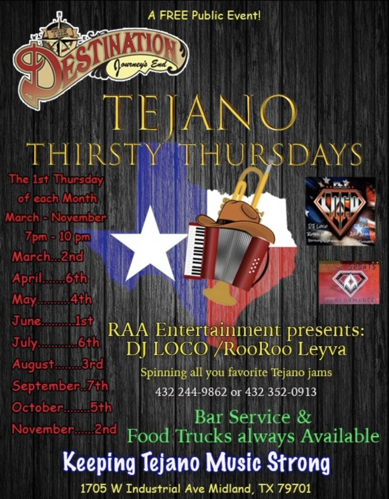 Tejano Thirsty Thursday hosted by RAW Entertainment with DJ LOCO/Rooroo Leyva & DJ NETA/Aaron Padilla. This is a “Back to School Party” INVITING ALL TEACHERS to The Destination Midland for their final days before school starts....come out and enjoy great music, food, and of course the cold drinks on Thursday, August 3rd at 7PM.