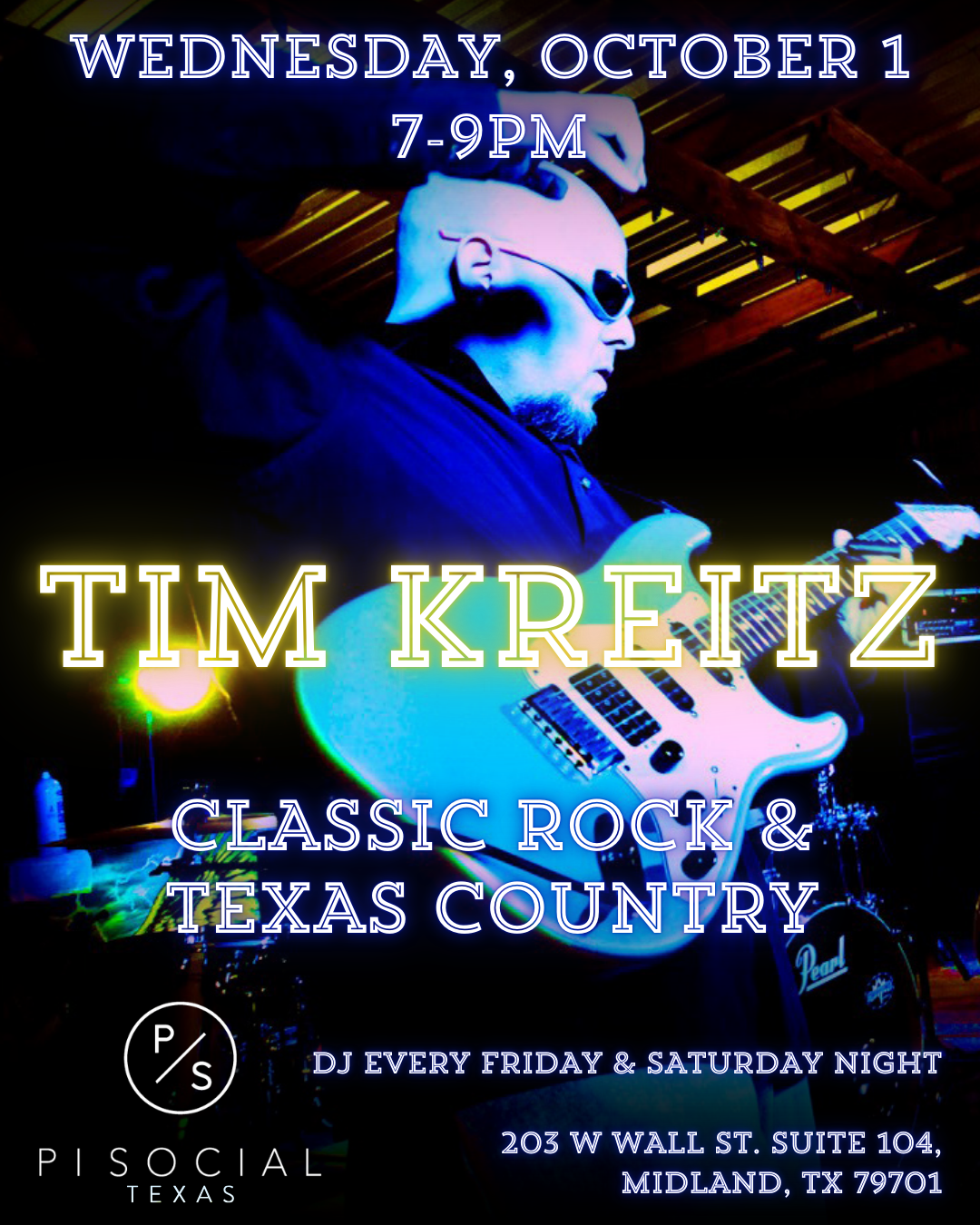 Join us at Pi Social for an evening with house favorite Tim Kreitz, whose unique blend of classic rock and red dirt country promises an unforgettable experience from 7-9 PM. Dive into the heart of downtown Midland’s vibrant social scene, complemented by our signature craft cocktails and gourmet cuisine, as Tim’s music brings the perfect soundtrack to a night of relaxation and enjoyment.