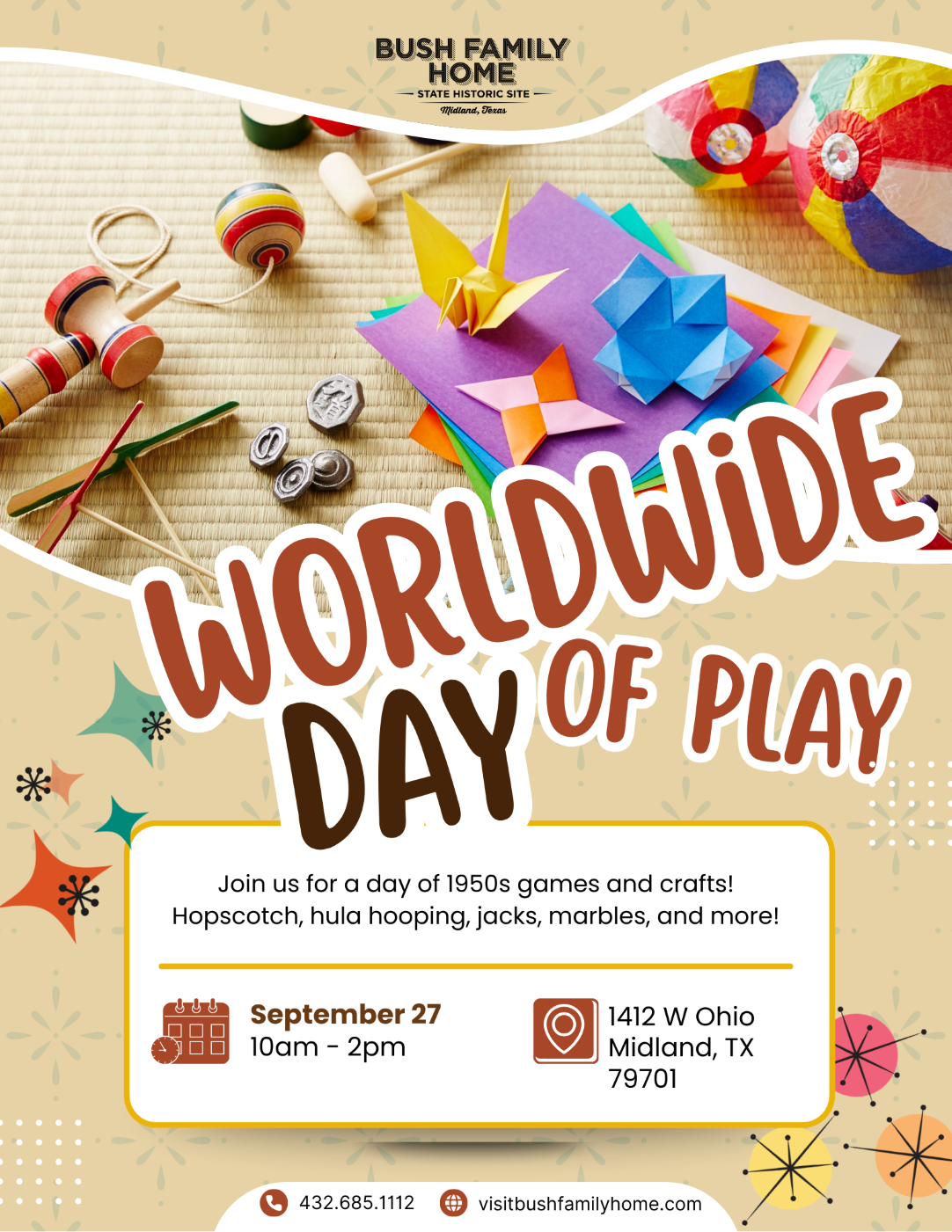 The Bush Family Home State Historic Site is joining other sites around the world to participate in the Worldwide Day of Play scheduled for September 27, 2025. The Worldwide Day of Play is a day set up by Nickelodeon and the Association of Children’s Museums as a day dedicated to experiencing joyful learning through play.