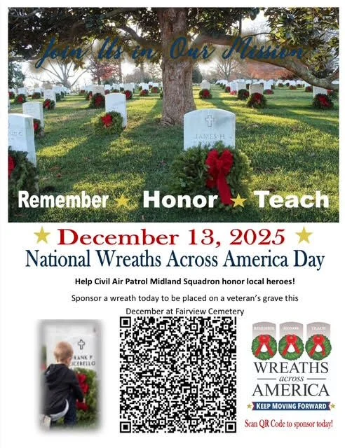 Help us say THANK YOU to our American Heroes by SPONSORING a Veteran's Wreath. We will place your sponsored wreath on the grave of one of our hometown heroes at Fairview Cemetery on Saturday, December 13, 2025. We are on a mission to remember the fallen, honor those who served and teach future generations about the value of FREEDOM! CLICK the LINK BELOW and follow the prompts to purchase your wreath TODAY!! Feel free to share this link to friends and family to help us reach our goal of getting 1,300 wreaths to fallen soldiers in Midland, TX! THANK YOU SO MUCH!!! https://wreathsacrossamerica.org/pages/187444/Overview/?relatedId=0